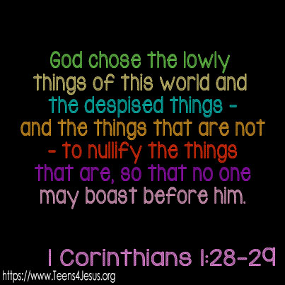 1 Corinthians 1:28-29 God chose the lowly things of this world and the despised things – and the things that are not – to nullify the things that are, so that no one may boast before him.