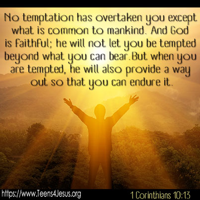 1 Corinthians 10:13 No temptation has overtaken you except what is common to mankind. And God is faithful; he will not let you be tempted beyond what you can bear. But when you are tempted, he will also provide a way out so that you can endure it.