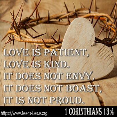1 Corinthians 13:4 Love is patient, love is kind. It does not envy, it does not boast, it is not proud.