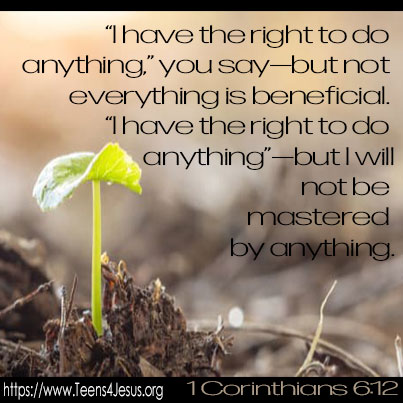 1 Corinthians 6:12 “I have the right to do anything,” you say—but not everything is beneficial. “I have the right to do anything”—but I will not be mastered by anything.