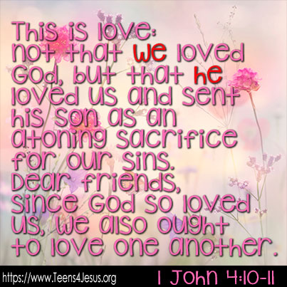 1 John 4:10-11 This is love: not that we loved God, but that he loved us and sent his Son as an atoning sacrifice for our sins. Dear friends, since God so loved us, we also ought to love one another.