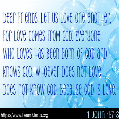 1 John 4:7-8 Dear friends, let us love one another, for love comes from God. Everyone who loves has been born of God and knows God. Whoever does not love does not know God, because God is love.