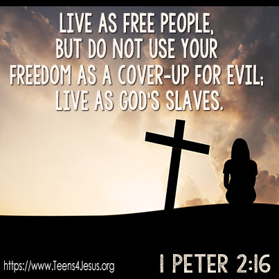1 Peter 2:16 Live as free people, but do not use your freedom as a cover-up for evil; live as God’s slaves.