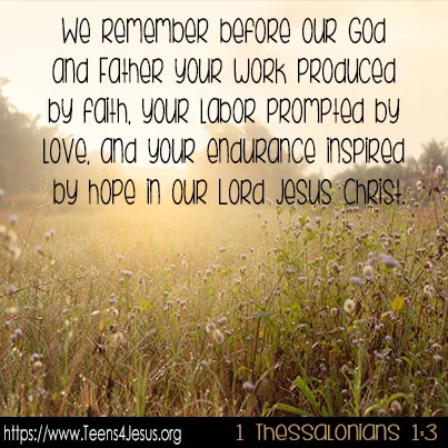 1 Thessalonians 1:3 We remember before our God and Father your work produced by faith, your labor prompted by love, and your endurance inspired by hope in our Lord Jesus Christ.