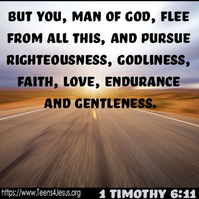 1 Timothy 6:11 But you, man of God, flee from all this, and pursue righteousness, godliness, faith, love, endurance and gentleness.