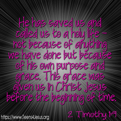 2 Timothy 1:9 He has saved us and called us to a holy life—not because of anything we have done but because of his own purpose and grace. This grace was given us in Christ Jesus before the beginning of time.