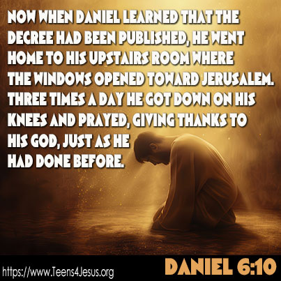 Daniel 6:10 Now when Daniel learned that the decree had been published, he went home to his upstairs room where the windows opened toward Jerusalem. Three times a day he got down on his knees and prayed, giving thanks to his God, just as he had done before.