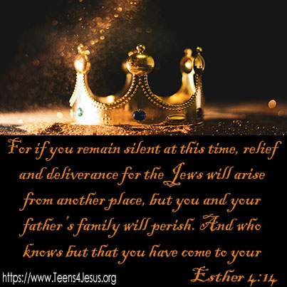 Esther 4:14 For if you remain silent at this time, relief and deliverance for the Jews will arise from another place, but you and your father’s family will perish. And who knows but that you have come to your royal position for such a time as this?”