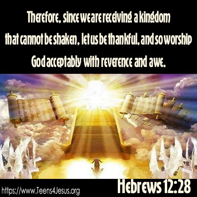 Hebrews 12:28 Therefore, since we are receiving a kingdom that cannot be shaken, let us be thankful, and so worship God acceptably with reverence and awe.