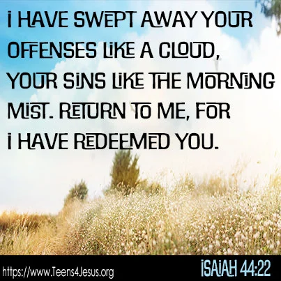 Isaiah 44:22 I have swept away your offenses like a cloud, your sins like the morning mist. Return to me, for I have redeemed you.