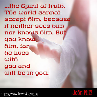John 14:17 …the Spirit of truth. The world cannot accept him, because it neither sees him nor knows him. But you know him, for he lives with you and will be in you.