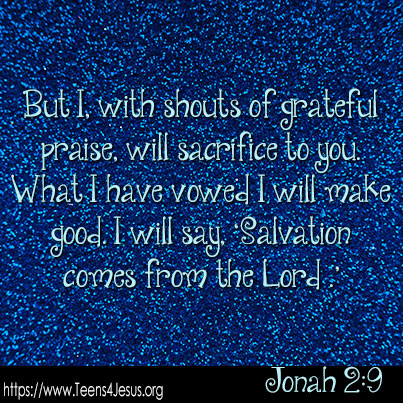 Jonah 2:9 But I, with shouts of grateful praise, will sacrifice to you. What I have vowed I will make good. I will say, ‘Salvation comes from the Lord .’