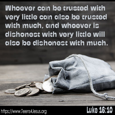 Luke 16:10 Whoever can be trusted with very little can also be trusted with much, and whoever is dishonest with very little will also be dishonest with much.
