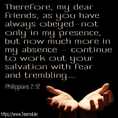 Philippians 2:12 Therefore, my dear friends, as you have always obeyed—not only in my presence, but now much more in my absence—continue to work out your salvation with fear and trembling…